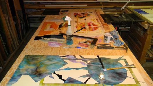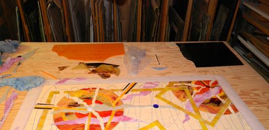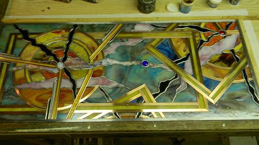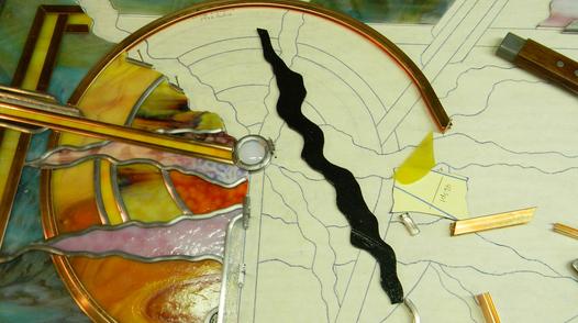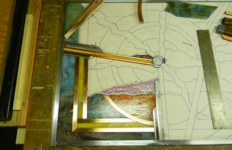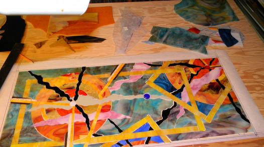 Here, assembly or "glazing" is underway. Typically, stained glass windows are assembled using lead channels holding the pieces of glass together. This piece features the use of wide copper channels in addition to the traditional lead channels (aka lead "came").