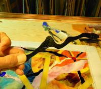 Assembly continues with lead and copper cames. Another of the delicate black "fractures" is ready to be fitted into the panel. Top half of the copper channel is in place to be marked for cutting. The lead came is cut with either a sharp knife or a lead dyke. The copper is cut on a table saw.