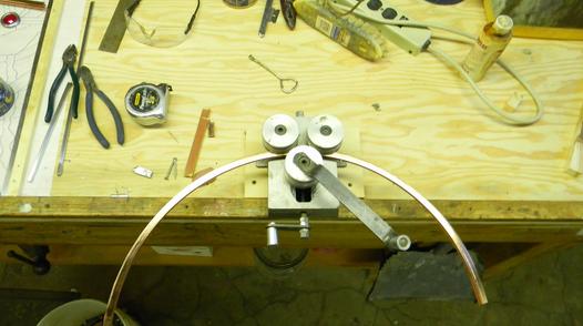Lead came is a soft metal and can easily be bent and cut by hand. The copper "came" used in this window is a very hard, stiff metal. A small metal roller is used to bend the copper to the precise radius required.