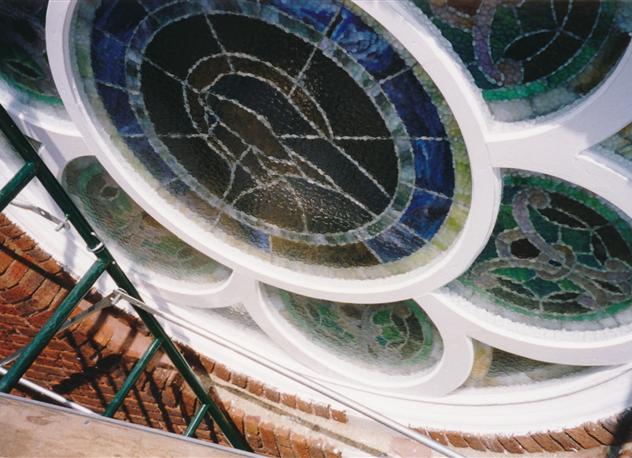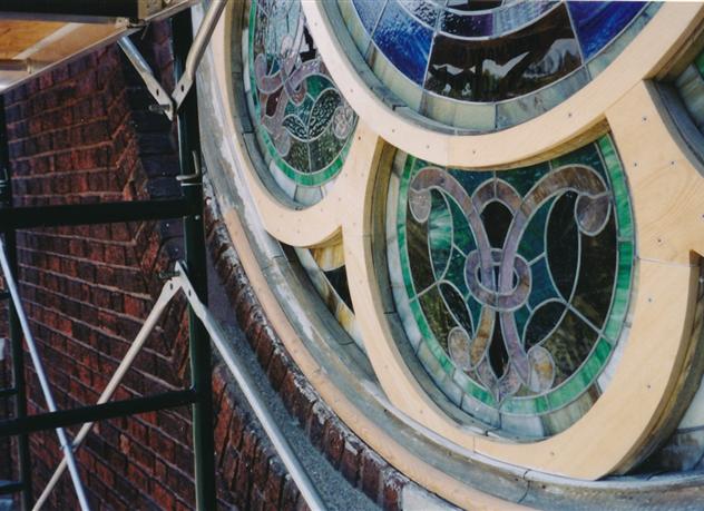 New plate glass protective glazing was the final step. The textured glass was chosen to simulate the protective glazing that was original to the building.