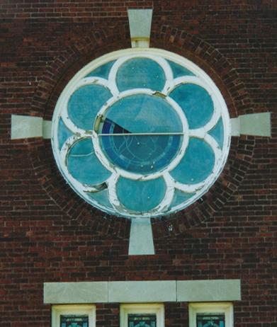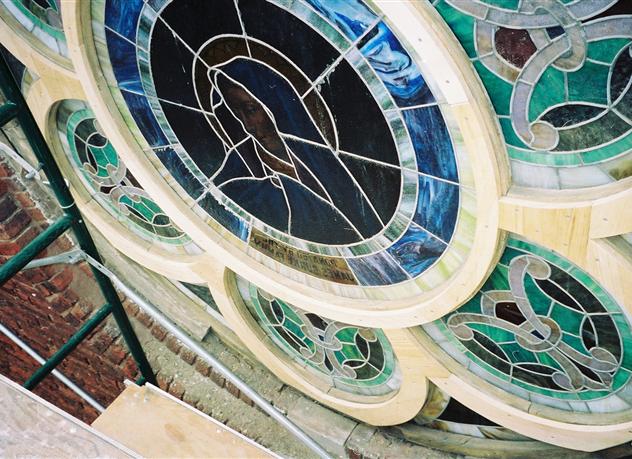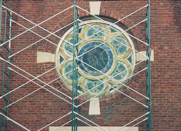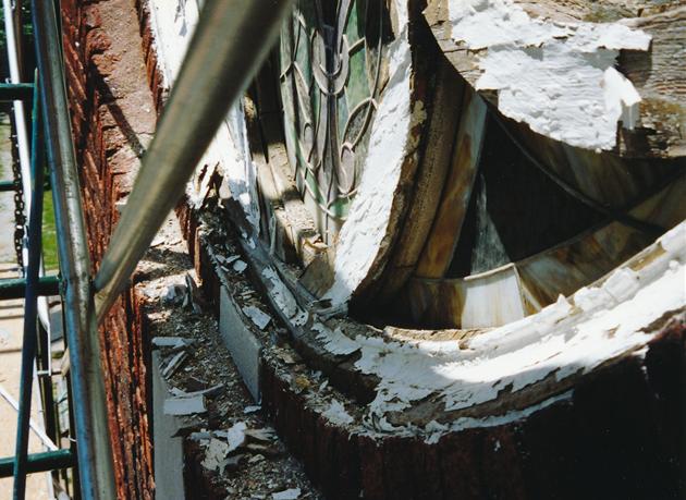 Two Rose Windows, one in each the north and south Transept were in very rough shape. Millwork was badly deteriorated. The existing Protective Glazing was peppered with BB holes and cracked panes. The Stained Glass itself was in good condition.